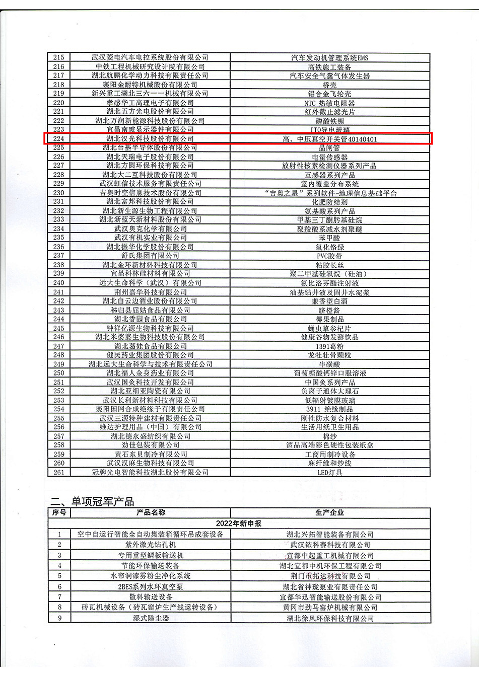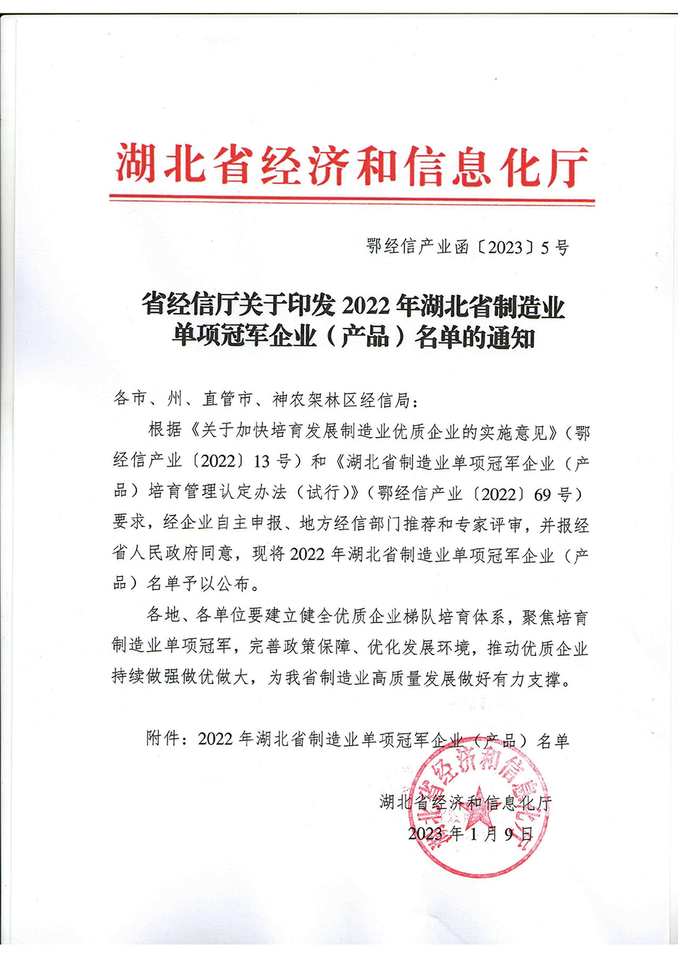 1月9日,湖北省經(jīng)濟(jì)和信息化廳印發(fā)《2022年湖北省制造業(yè)單項(xiàng)冠軍企業(yè)(產(chǎn)品)名單的通知》,公司成功通過(guò)省制造業(yè)單項(xiàng)冠軍企業(yè)復(fù)審。