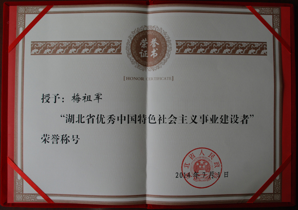 2014年7月23日,省政府在武漢東湖賓館隆重召開第三屆湖北省優(yōu)秀中國(guó)特色社會(huì)主義事業(yè)建設(shè)者表彰大會(huì),公司董事長(zhǎng)梅祖軍獲得此榮譽(yù)稱號(hào)。