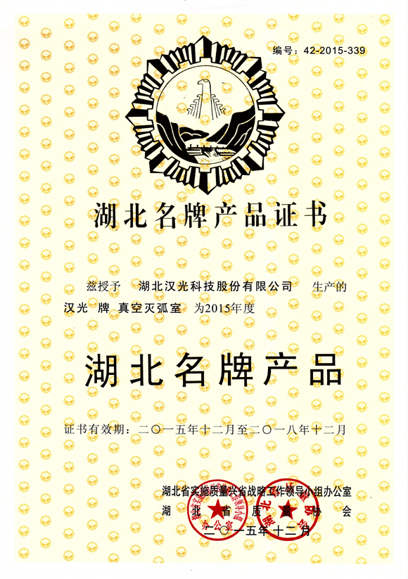 2015年12月30日,我公司生產(chǎn)的“漢光”牌真空滅弧室繼2012年之后,再次被湖北省實施質(zhì)量興省戰(zhàn)略工作領(lǐng)導(dǎo)小組辦公室、湖北省質(zhì)量協(xié)會評為2015年度湖北名牌產(chǎn)品。