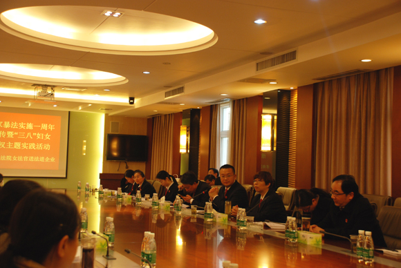 2017年3月2日,孝南區(qū)法院黨組成員、副院長廖玉華和孝南區(qū)法院黨組成員、工會主席劉光輝帶領區(qū)法院送法進企業(yè)工作組,走進漢光,開展反家暴法實施一周年宣傳暨“三八”婦女維權主題實踐活動,公司執(zhí)行總經(jīng)理張文杰、工會主席趙化先、總法律顧問任世昭,以及公司部分女職工代表參加活動。